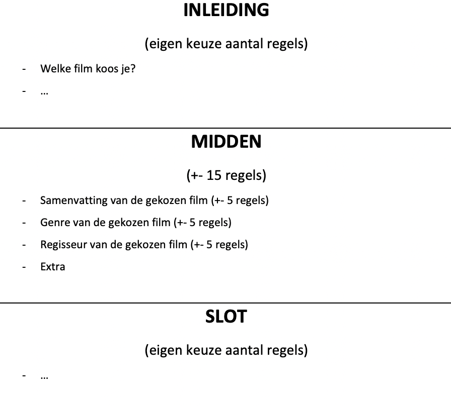 Je schrijft je puntjes nu volledig uit tot een volwaardige tekst. Vergeet geen inleiding, midden en slot en vermeld zeker in je tekst welke film je koos.